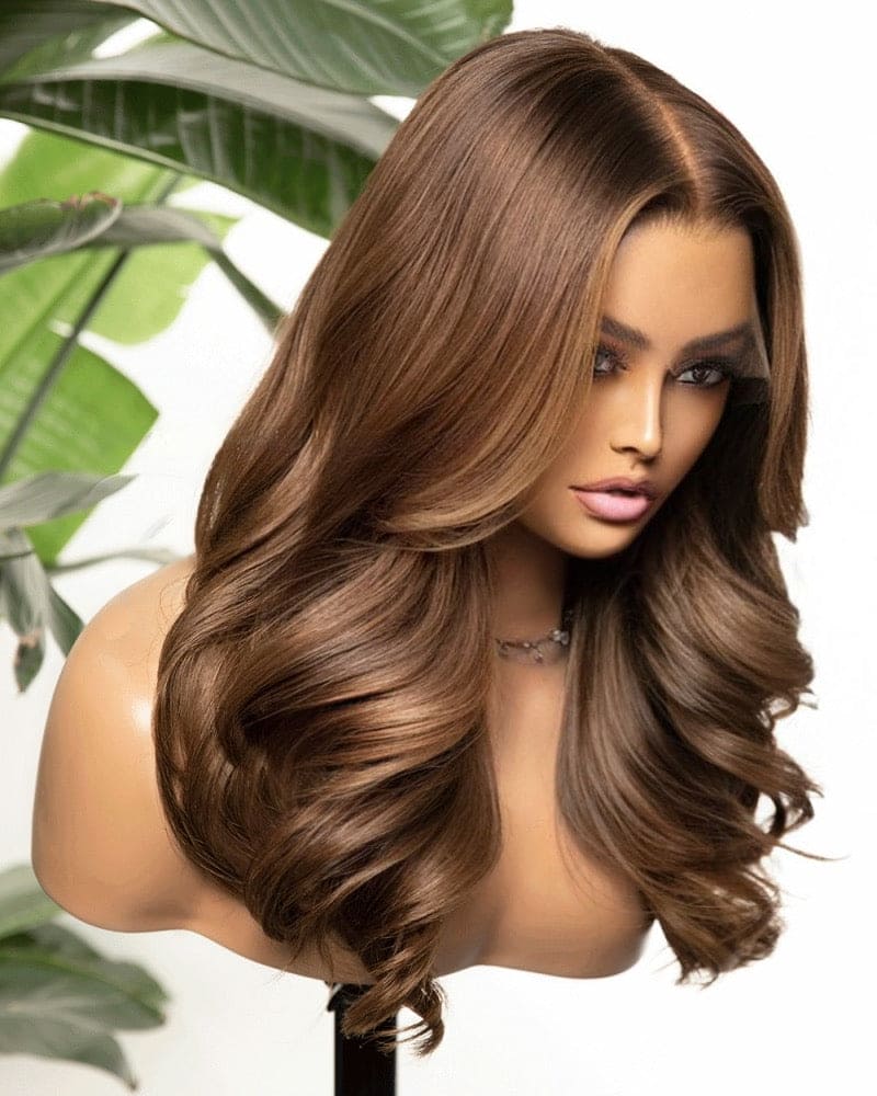 This Custom coloured brown is a show stopper. With different shades of chestnut brown combined with ashy blonde highlights, this wig is sure to take your look to the next level.