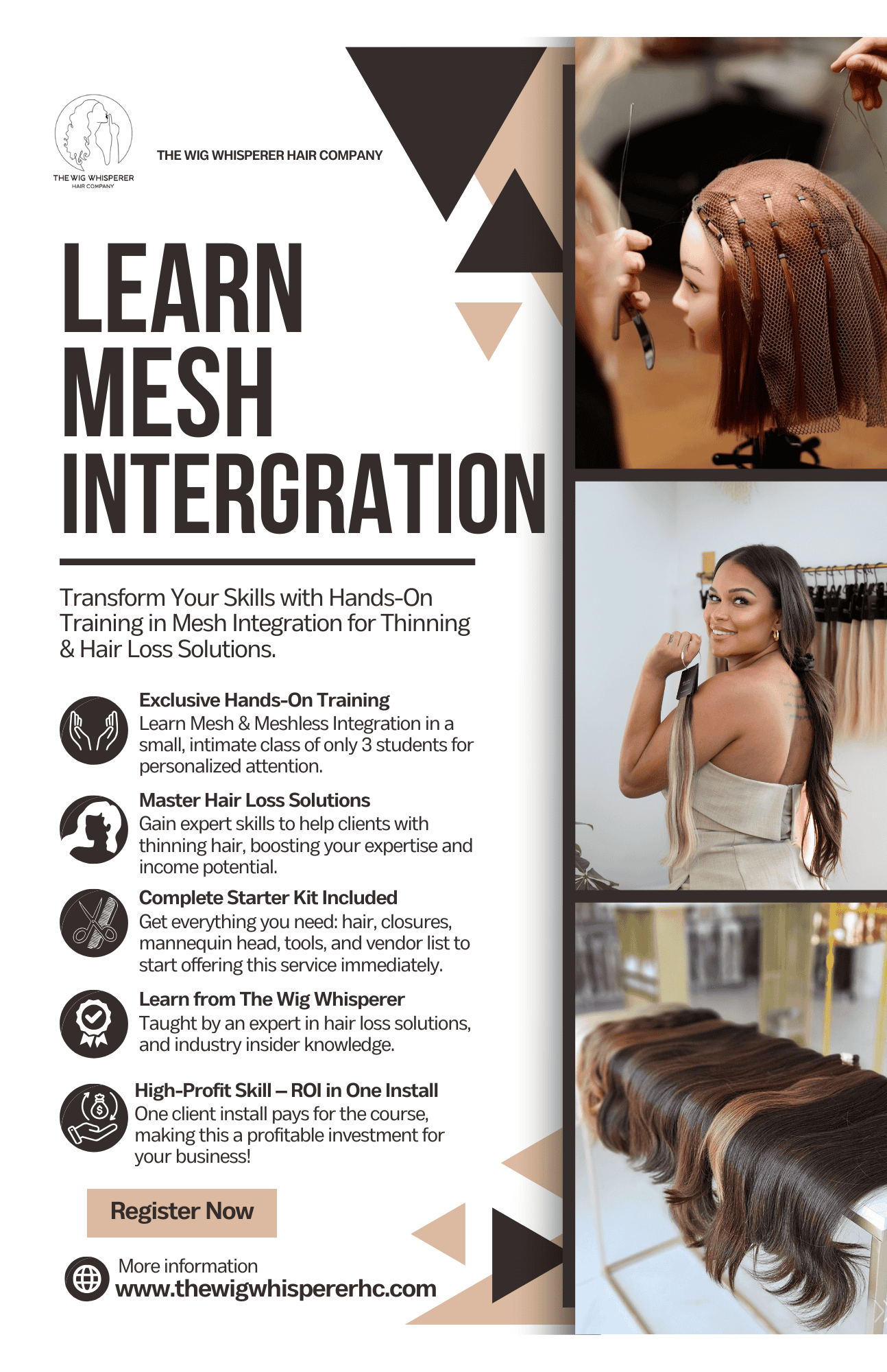 Are you ready to expand your skills and become a go-to expert in hair loss solutions? This exclusive, one-day Mesh Integration Masterclass is designed for stylists who want to offer custom solutions for thinning hair and hair loss—a high-demand, high-ticket service that sets you apart in the industry.